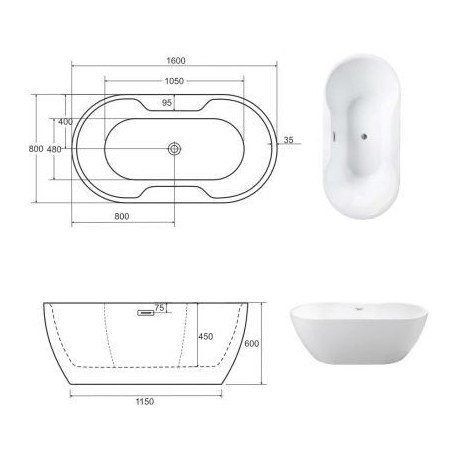 Besco > Ванные > Ванные напольные > Assos > Ванна свободностоящая Besco Navia 160x80 cm овальная белая, maskownica syfonu z переливом белая
