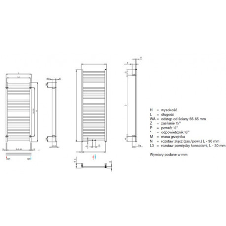 Водяное питание z przyłączem środkowym 50 mm oraz dolnym w kolektorach pionowych.