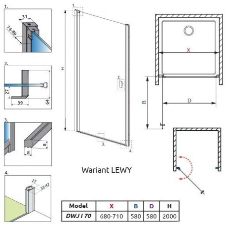 Двери для душа для ниши Radaway Nes Black DWJ I 70, бесцветное, левые, 680-710x2000mm, чёрный profil